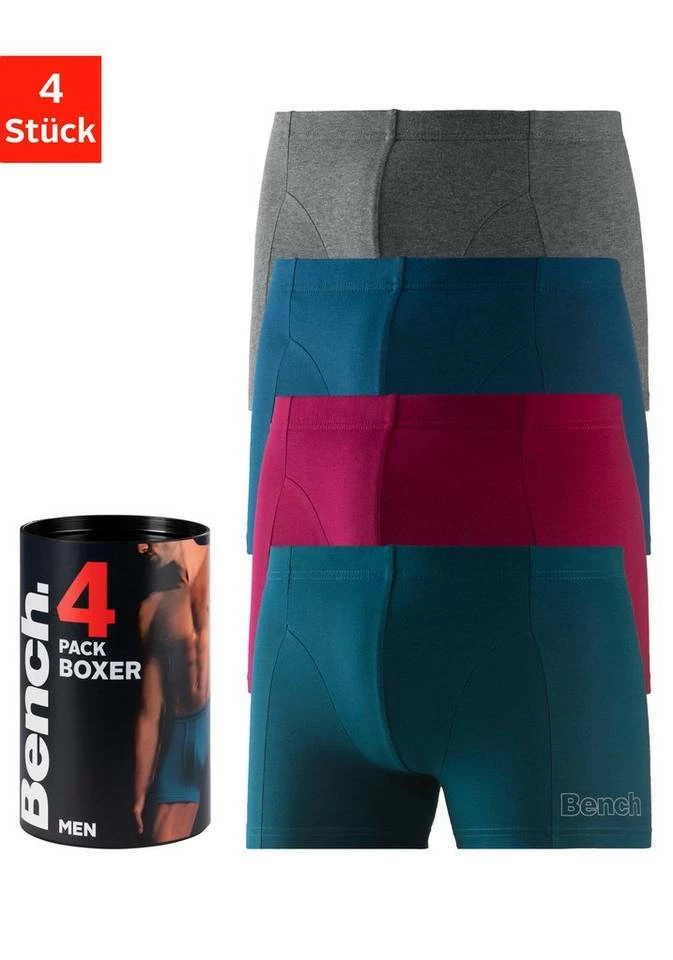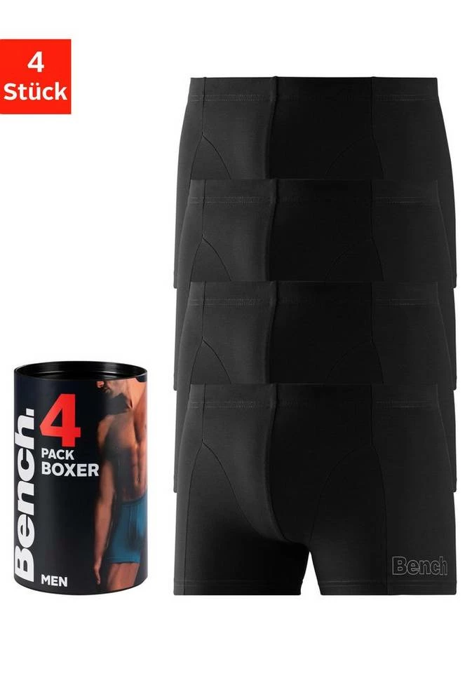 Wer es sonst lieber nicht aus der Konserve mag, wird sich über die in einer praktischen 4er-Dose verpackten Boxer von Bench ganz anders freuen! Aber Spaß beiseite: Diese anliegenden, einfarbigen Boxershorts strotzen wirklich nur so vor sportlich minimalistischem Style und hohem Tragekomfort. Für letzteren zeichnen zum einen der Stretchbund und zum anderen das elastische Single-Jersey-Material aus Baumwolle verantwortlich. Eines ist also sicher: Mit den Boxern im 4er-Pack von Bench macht man(n) garantiert nichts verkehrt.