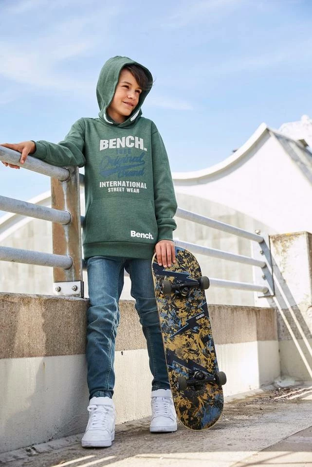 Probieren geht über kopieren: Mit diesem Kapuzensweatshirt von Bench. erfinden Teens ihren eigenen Style. Es wirkt mit dem Aufdruck peppig und dynamisch. Die Ärmel enden in einem Rippbündchen. Es ist basic geschnitten, sodass die Bewegungsfreiheit nicht leidet. Die vorne am Bauch aufgenähte Kängurutasche macht den bequemen Hoodie-Look komplett.