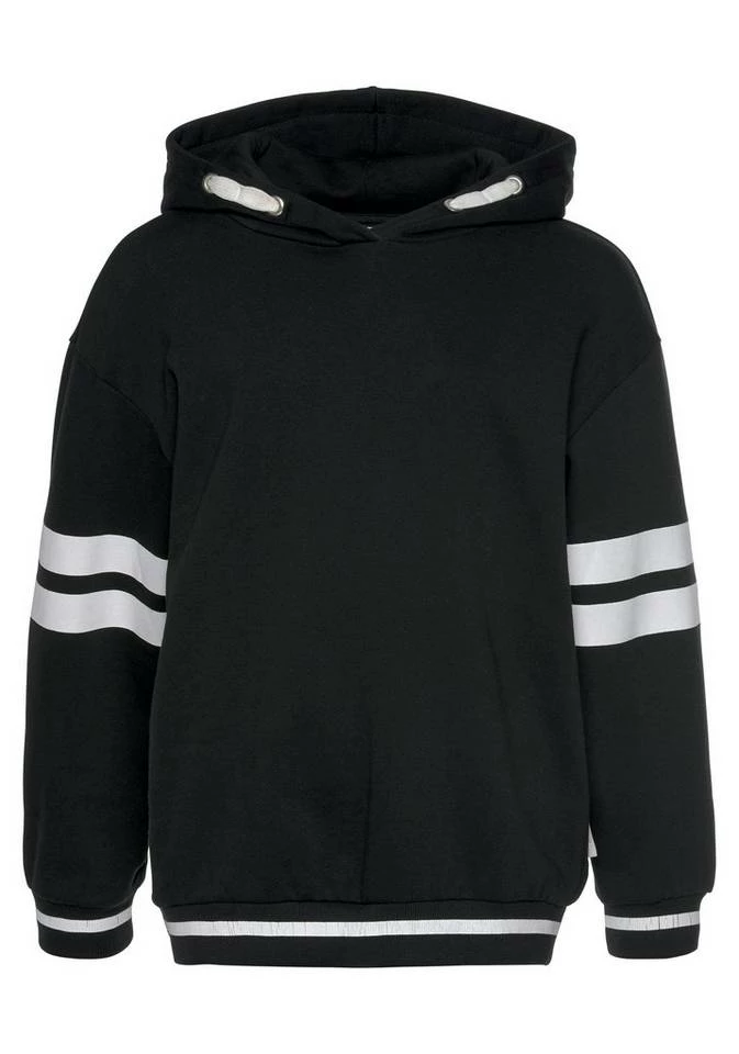 Ein modernes Design und einen gemütlichen Fit bietet dieser Hoodie von Bench für Mädchen. Das coole Sweatshirt hat angesagte Kontraststreifen an den Ärmeln und am Saum sowie einen großen Logoprint hinten. Ebenfalls farbig abgesetzt erscheint der breite Tunnelzug an der Kapuze in Wickeloptik. Den hohen Komfort verdankt der Kapuzenpulli seiner entspannten Passform mit breiten Rippbündchen und seiner weich angerauten Baumwollqualität. Ideale Stylingpartner dazu sind Sneakers und Leggings. Ein angenehmer Begleiter beim Sport und in der Freizeit – der tolle Hoodie von Bench für Mädchen!