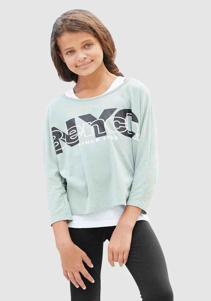 Für coole Girls: Dieses Fledermausshirt im zweiteiligen Set von Bench für Mädchen wirkt lässig durch seinen Lagen-Look. Das anschmiegsame gerippte Top darunter ist verlängert geschnitten und ragt am Saum deutlich hervor. Das Shirt in entspannter Oversize-Form hat einen weiten Rundhalsausschnitt und angesagte 3/4-Ärmel. Für eine trendige Optik sorgt sein großer Logoprint vorn. Beim Tragen begeistert die modische Kombi aus Baumwolljersey durch einen soften Komfort. Natürlich können beide Teile aber auch einzeln getragen werden. Sneakers und Jeansshorts dazu sind perfekte Kombipartner. Trendoutfit zum Wohlfühlen – das Fledermausshirt im zweiteiligen Set von Bench für Mädchen!