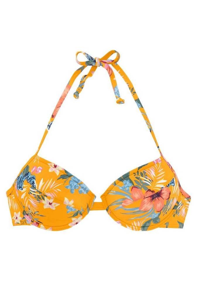 Noch kein passendes Strandoutfit parat? Mit diesem hübschenPush-up-Bikinitop von Bench machst du schon einmal einen guten Anfang! Das tropische Design passt nämlich perfekt zur Urlaubsstimmung und setzt dich am Pool, Strand oder beim Schnorcheln ins richtige Licht. Wattierte Cups mit herausnehmbaren Kissen und im Nacken zu bindende Träger sorgen immer für einen guten Sitz und Halt. Kombinieren kannst du das weiche Push-up-Top zu einem schlichten Bikinihöschen oder Jeansshorts, ganz wonach dir gerade ist. Sollte in deinem Reisegepäck auf keinen Fall fehlen: das Bikinioberteil von Push-up-Bikinitop! Obermaterial: 84% Polyamid, 16% Elasthan. Wattierung: 100% Polyester.