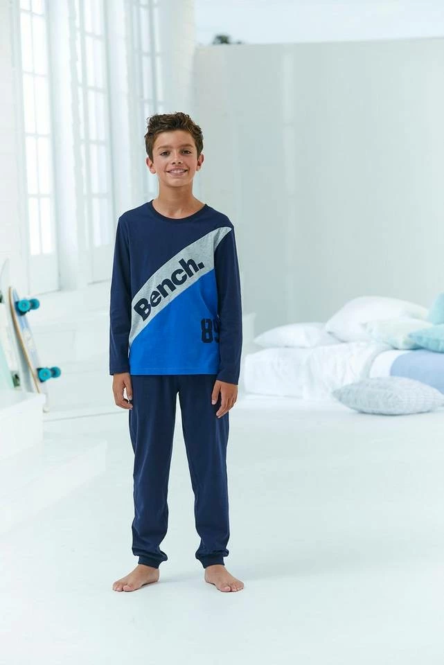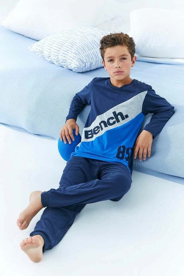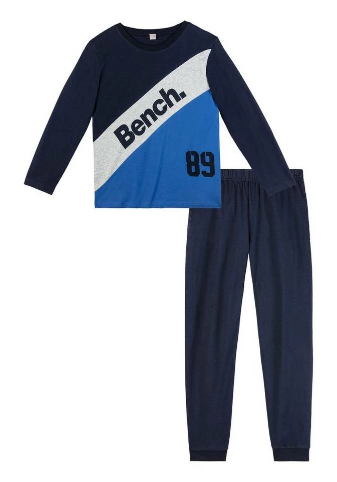 Markenqualität in sportlich-lässiger Optik bekommen Jungs mit dem langen Pyjama von Bench gereicht. Cooler Style ist hier schon allein durch die Kontrasteinsätze am langärmeligen Rundhalsoberteil garantiert. Die einfarbig gehaltene Schlafhose kommt praktischerweise mit seitlichen Eingrifftaschen und ist damit zu Hause auch außerhalb des Betts gut zu tragen. Lädt immer zum Relaxen ein: der weiche und bequeme Single-Jersey-Pyjama von Bench – nur für coole Jungs!