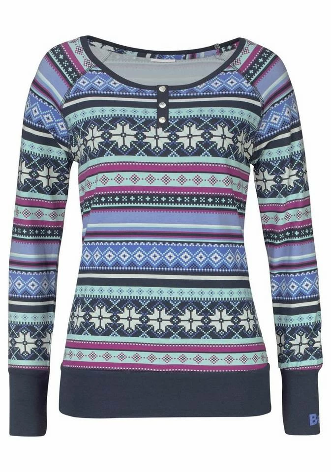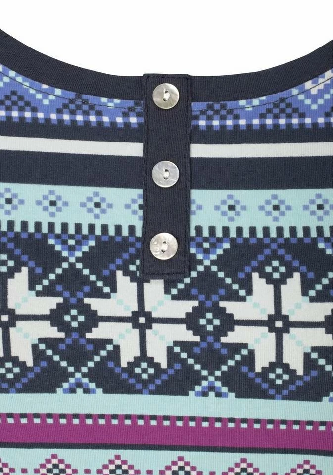 Nicht nur für Skandinavien-Fans geeignet ist dieser tolle Pyjama von Bench. Hier kannst du dich wirklich sattsehen an dem angesagten Norweger-Muster, denn sowohl das Oberteil als auch die Schlafanzughose sind damit ausgestattet und es wird durch kontrastfarbene Rippbündchen an den Säumen schön akzentuiert. Das Langarmshirt im Raglanschnitt hat Flatlocknähte und der Blick fällt sofort auf die schöne Perlmuttknopfleiste und die Kontrastpaspeln am Rundhalsausschnitt. Der Schlafanzug ist körpernah geschnitten, aber trotzdem nicht unbequem oder eng, da er aus elastischem Baumwoll-Single-Jersey gefertigt ist und jeder deiner Bewegungen nachgibt. In dem Pyjama von Bench ist Wohlfühlen garantiert.