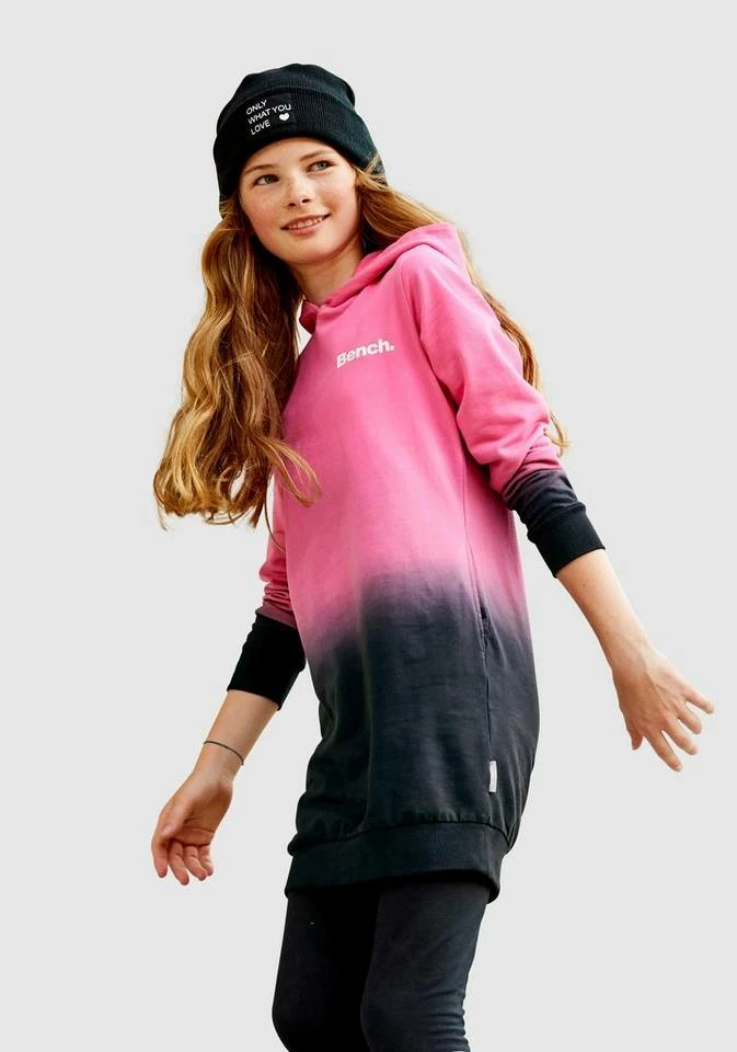 Einen Wow-Effekt garantiert dir dieses tolle Sweatkleid von Bench für Mädchen mit seinem aufwendigen Farbverlauf, der jedes Teil zum Unikat macht. Das Freizeitkleid mit kleinem Logodruck vorn hat eine gefütterte Kapuze in Wickeloptik und breite Rippbündchen an Ärmeln und Saum, die für seinen guten Sitz sorgen. Seinen Tragekomfort unterstreicht die leichte, angenehm weiche Sweatqualität. Leggings und stylische Sneakers machen dein Trendoutfit komplett. Ein Kunstwerk zum Anziehen: das wunderschöne Sweatkleid von Bench für Mädchen!