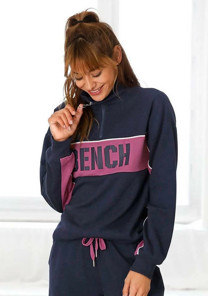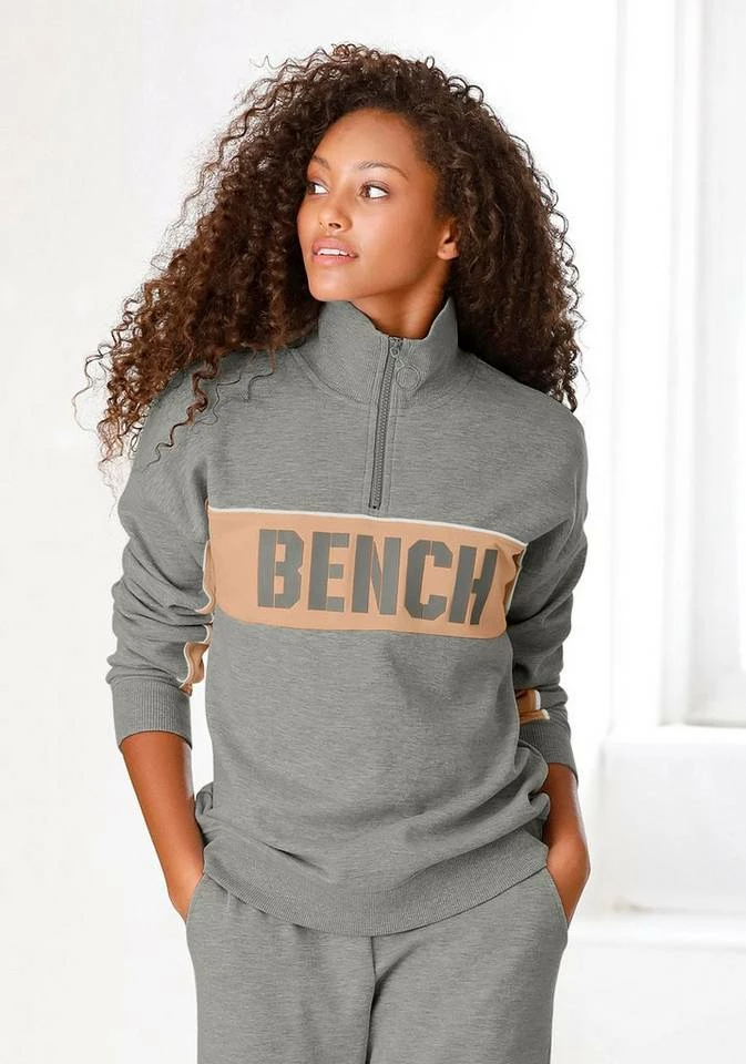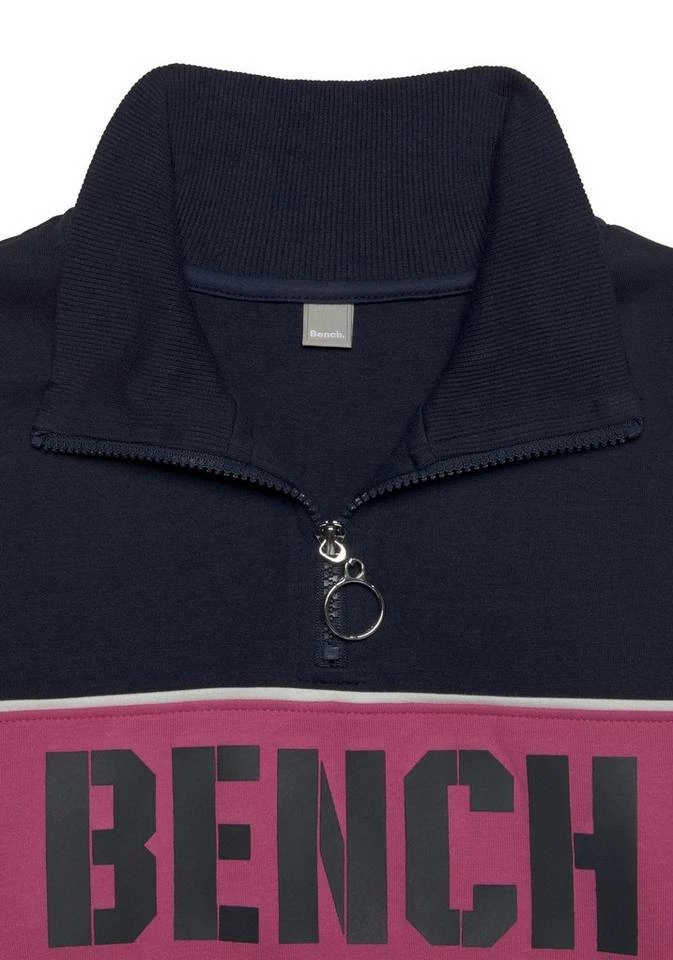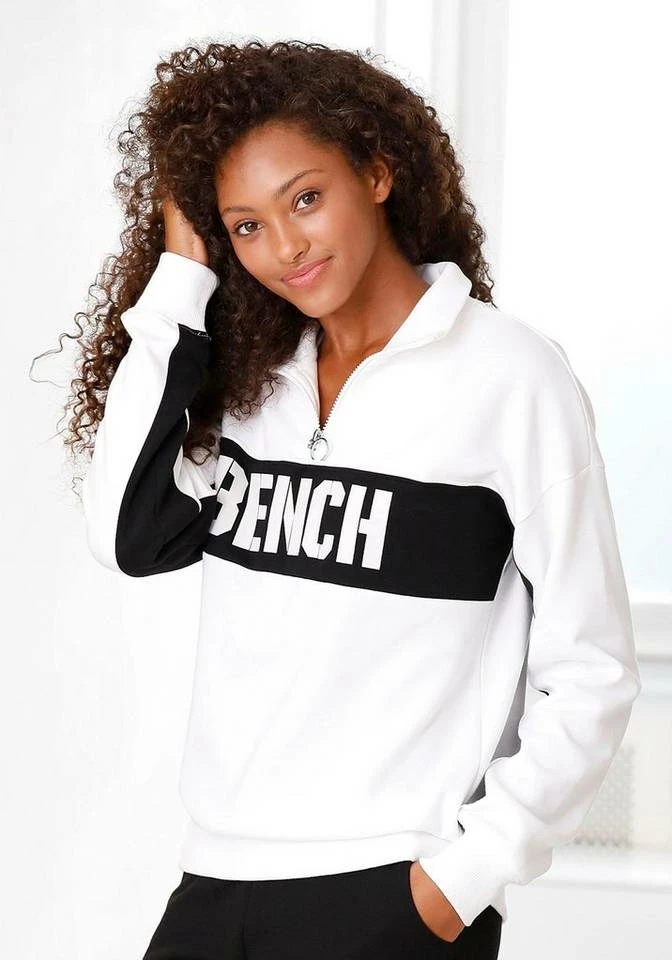 Hier schlüpfst du hinein und fühlst dich wohl! Das weiche Sweatshirt von Bench aus kuscheliger Sweatqualität wird garantiert dein neues Lieblingsteil. Der softe Sweater überzeugt optisch mit einem hohen, gerippten Kragen mit Reißverschluss, der nicht nur cool aussieht, sondern auch deinen Hals an kühlen Tagen warmhält. Außerdem punktet der modische Sweatpullover im 80s-Look mit einem großen, kontrastfarbenen Bench-Logodruck und Piping, mit dem du dich überall sehenlassen kannst. Am besten trägst du das Sweatshirt von Bench mit High-waist-Jeans und Turnschuhen und genießt die anerkennenden Blicke.