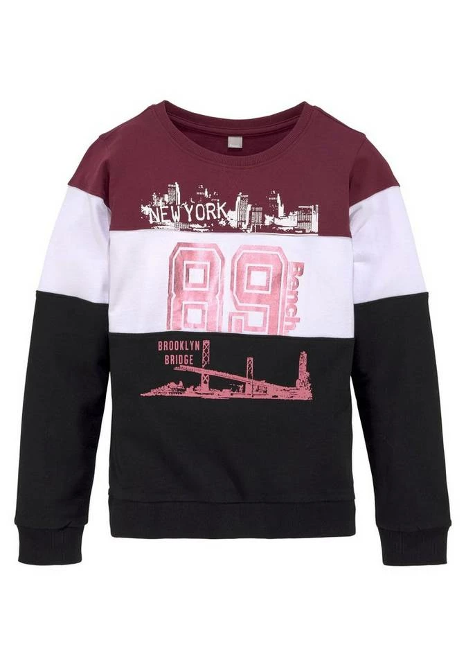 Mit dem Design in Blockoptik garantiert di dieses schöne Sweatshirt von Bench für Mädchen einen coolen Auftritt. Vorn ist das Modell mit großen Motiven bedruckt. Der größte Eyecatcher ist dabei sein toller, schimmernder Markenprint aus Glanzfolie. Die bequeme Basicform des leichten Sweaters mit Rundhalsausschnitt sitzt dank elastischer Rippbündchen ideal. Schlichte Jogginghosen und Sneakers ergänzen dein sportliches Freizeitoutfit trendy. Hoher Komfort- und Stylefaktor: das lässige Sweatshirt von Bench für Mädchen!
